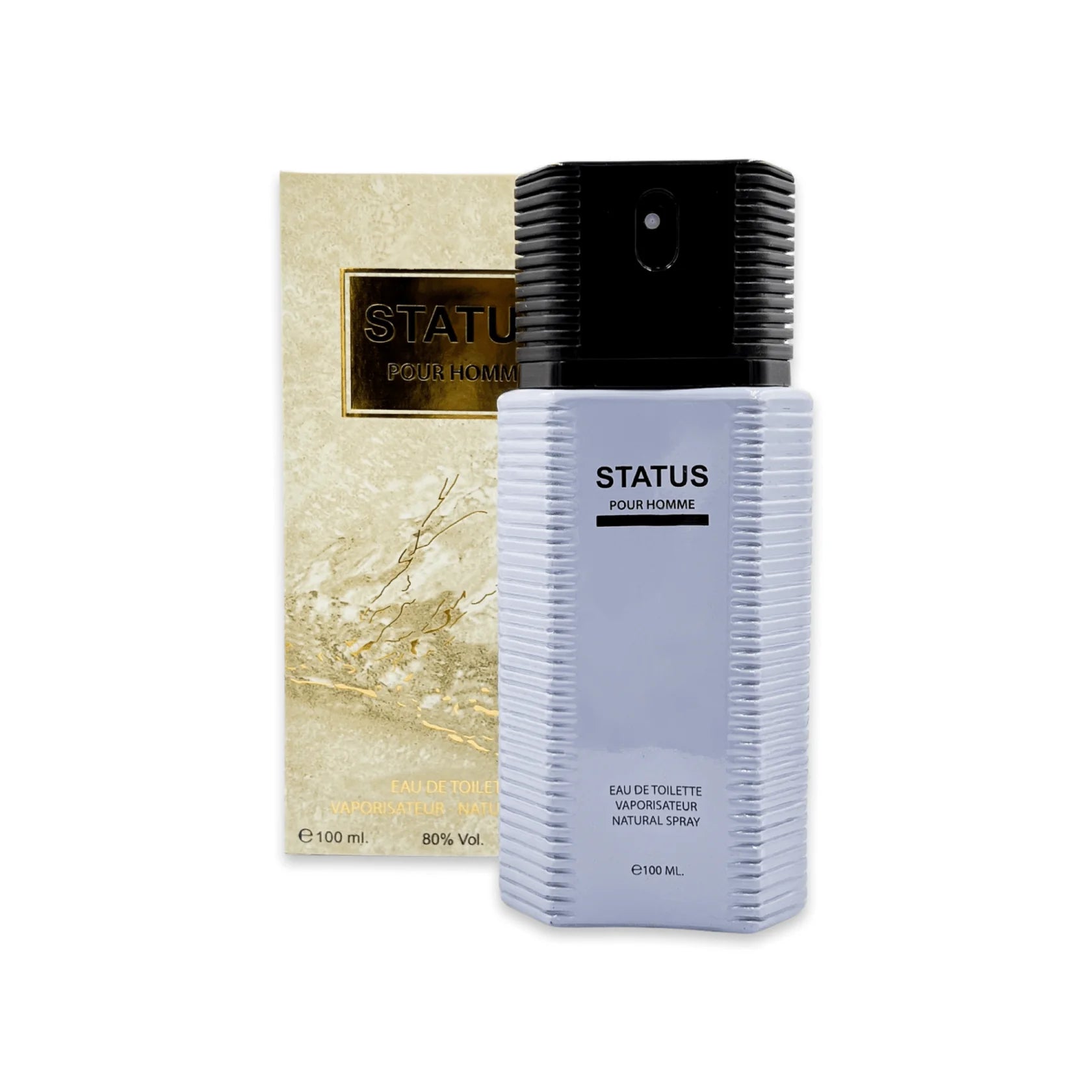 Presented in a sophisticated marble-textured box with a gold nameplate, STATUS Pour Homme reflects understated luxury and classic masculine appeal.